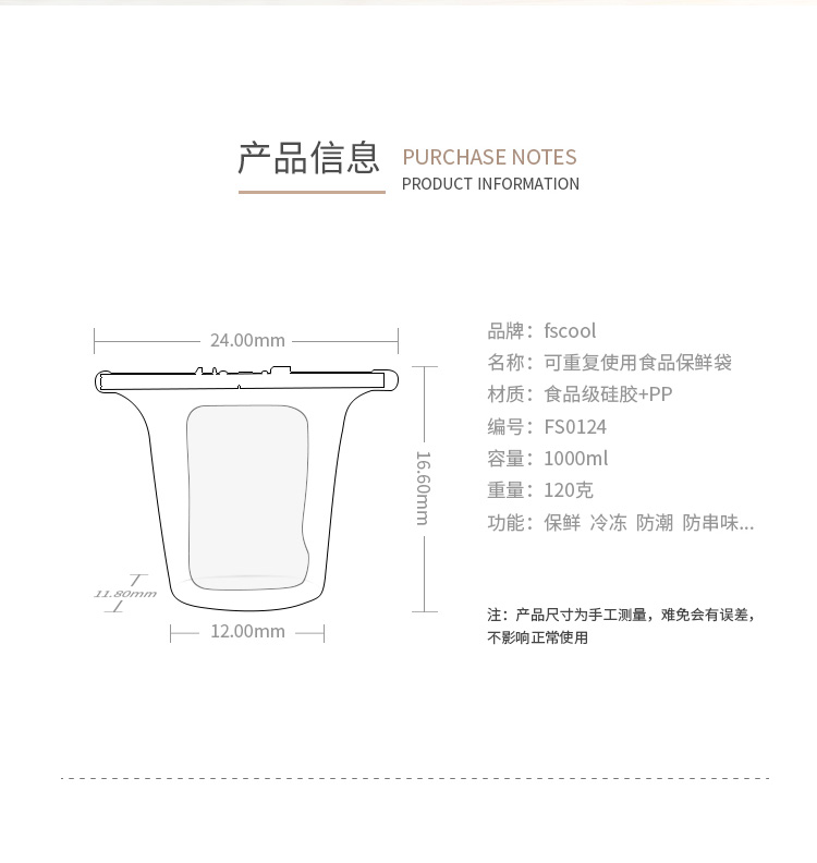 产品功能:保鲜、冷冻、微波、防潮、防串味。采用食品级硅胶材质,健康环保,采用独特的双颊式封口,密封性能非常好,袋身有多种容量刻度,保存时可以更加清晰明了,非常实用,机械式的开口使抽取物品更加便利,收纳也更加方便。