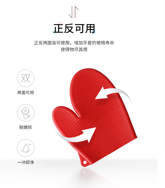 正反两面皆可使用,增加手套的使用寿命,使得物尽其用,翻转过来也是正常使用,耐磨损。耐脏易清洁,不怕脏,清洗方便,因为是优质的食品级硅胶材质,很容易可以清洗,节省时间。