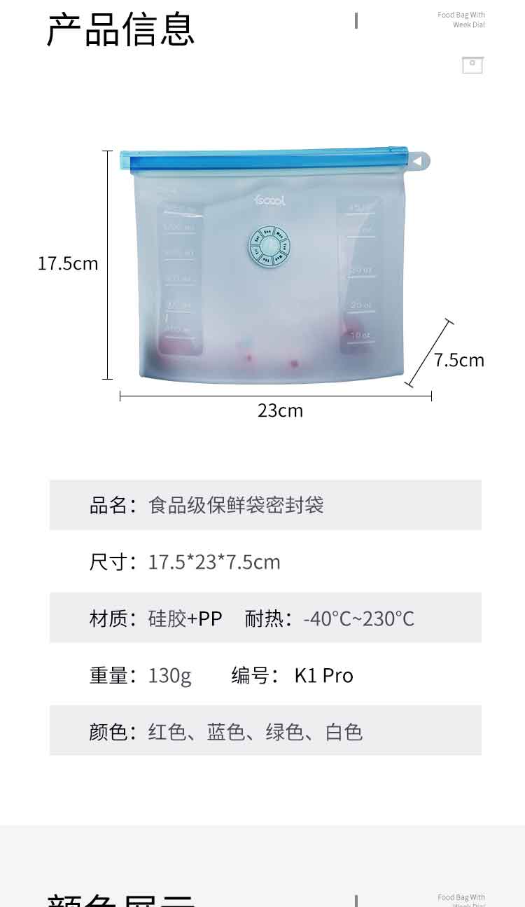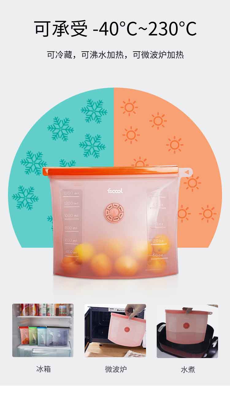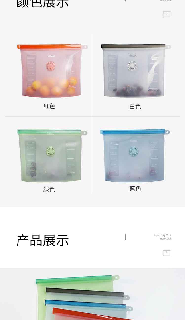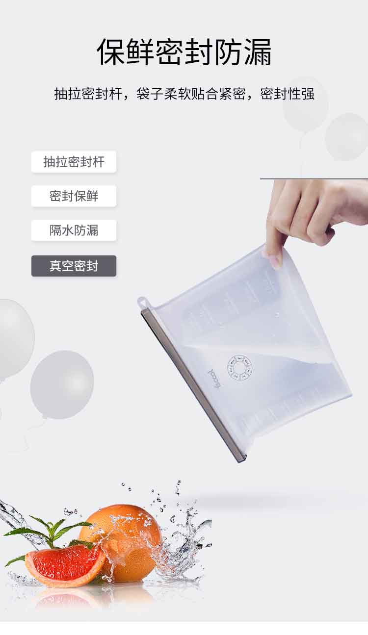 【特点】:食品级耐高温铂金硅胶材质,用于蔬菜、鱼类、肉类及果汁等包装存储冰箱,不同颜色分类使用。保鲜密封不串味。