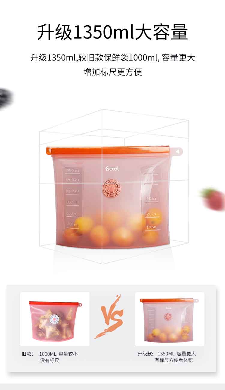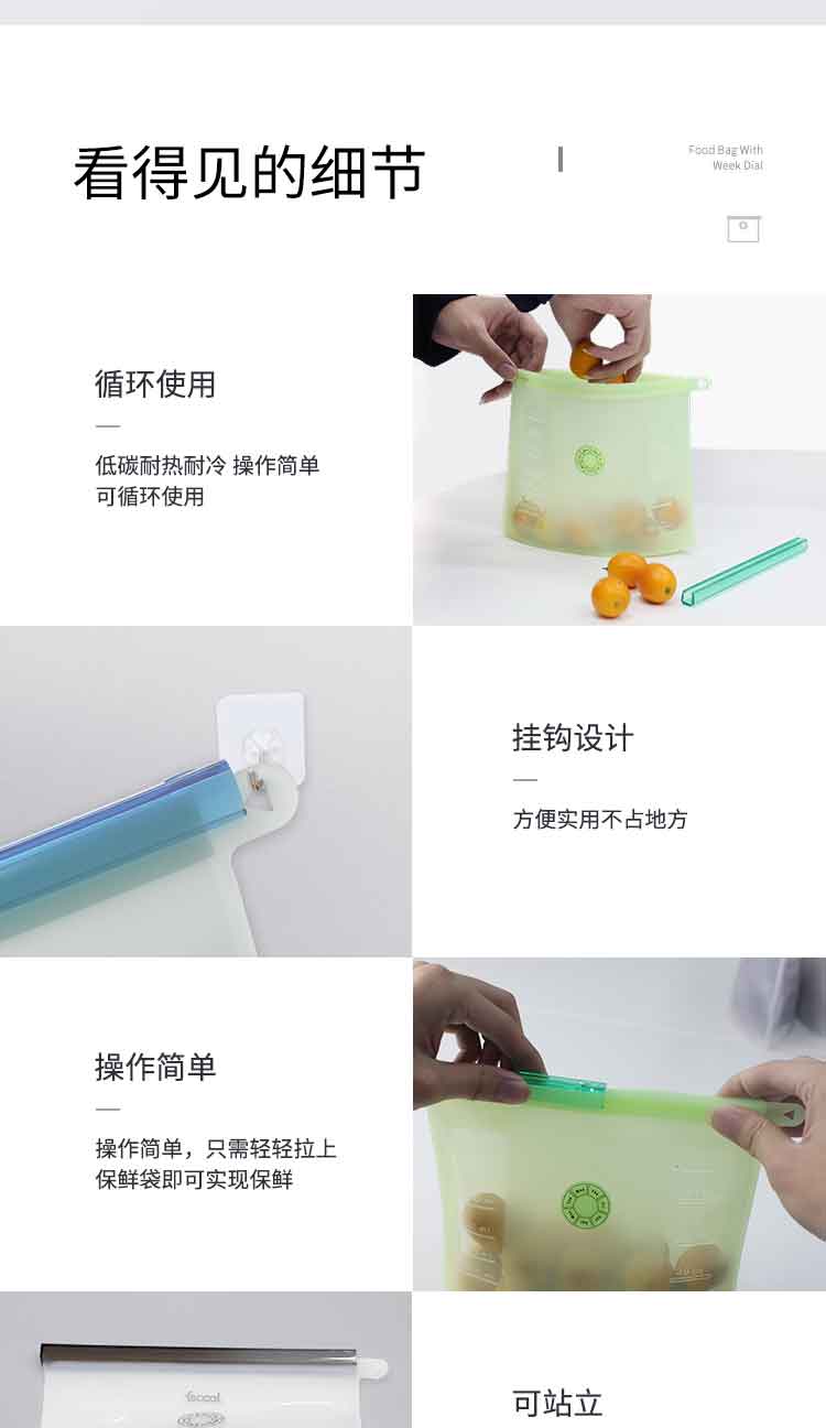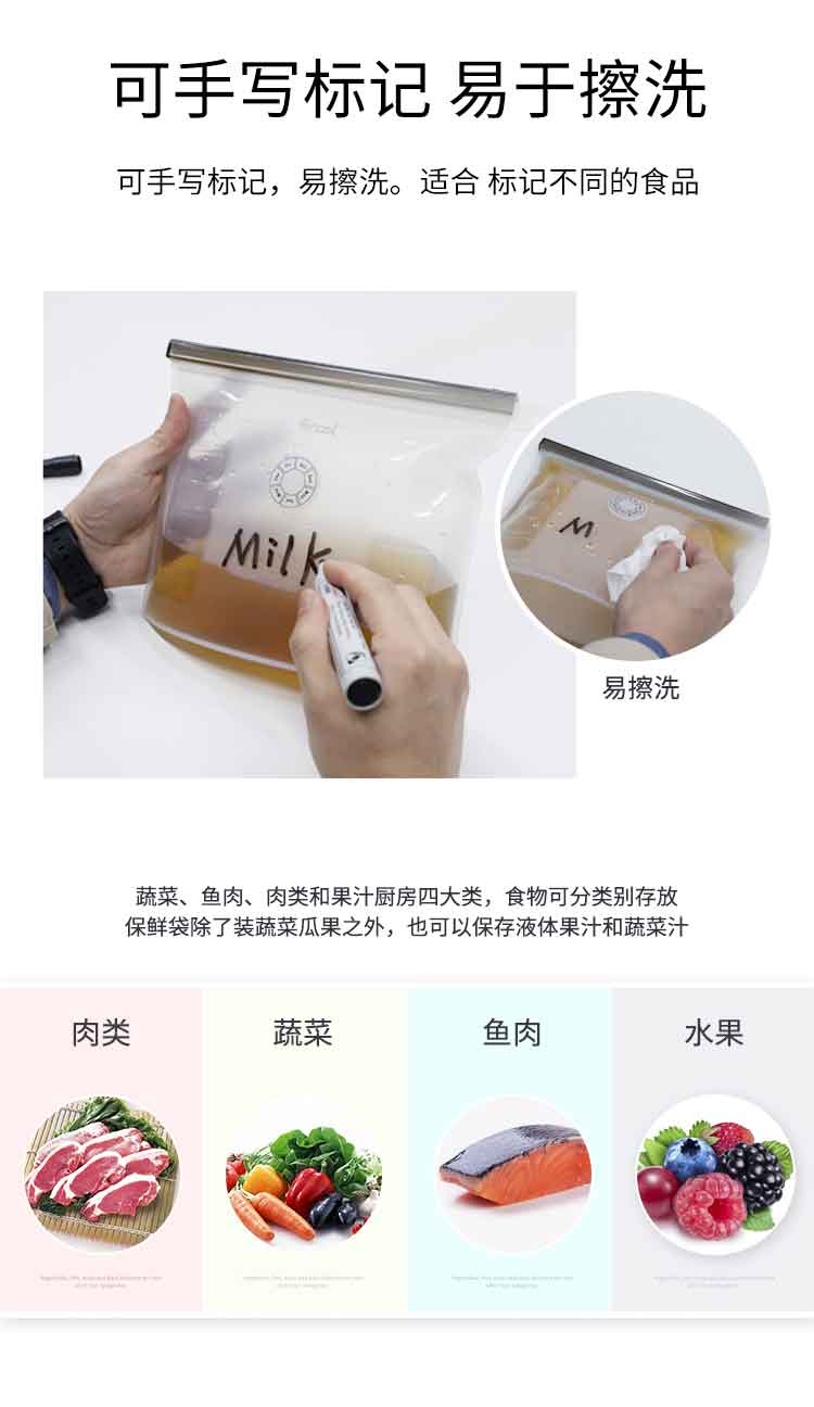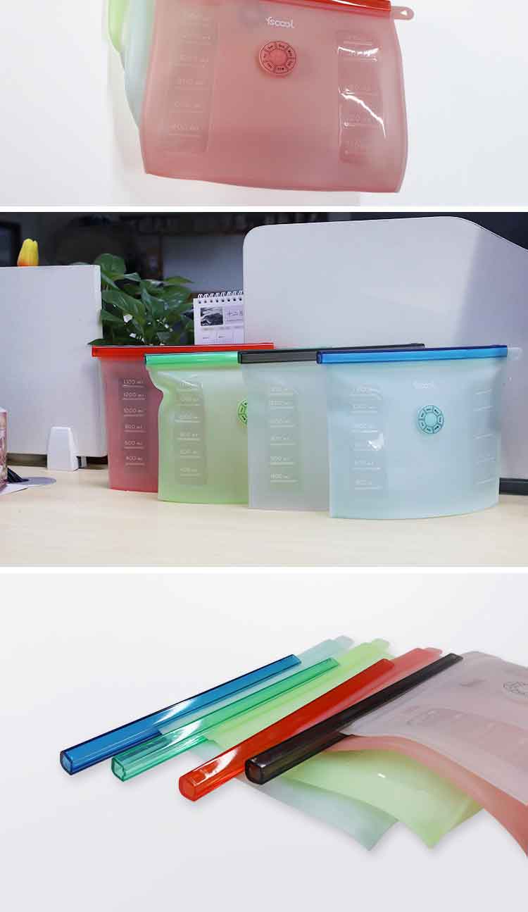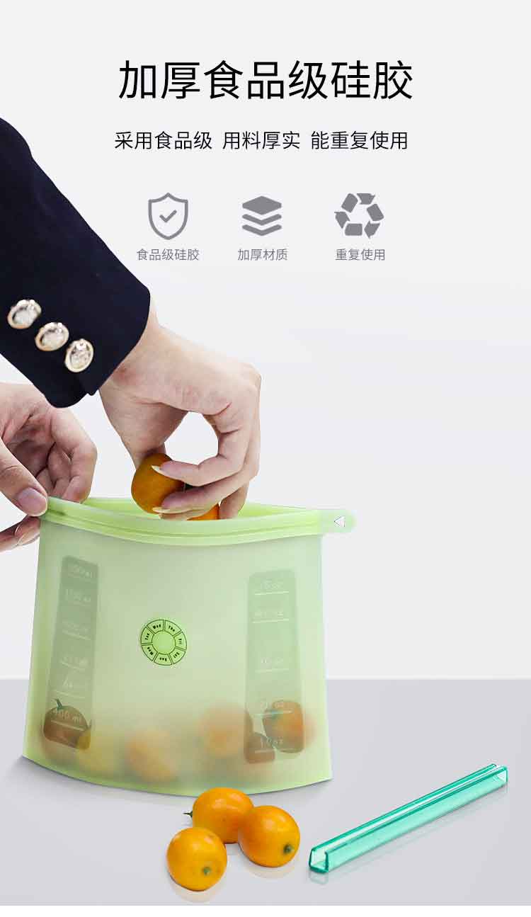 【特点】:食品级耐高温铂金硅胶材质,用于蔬菜、鱼类、肉类及果汁等包装存储冰箱,不同颜色分类使用。保鲜密封不串味。
