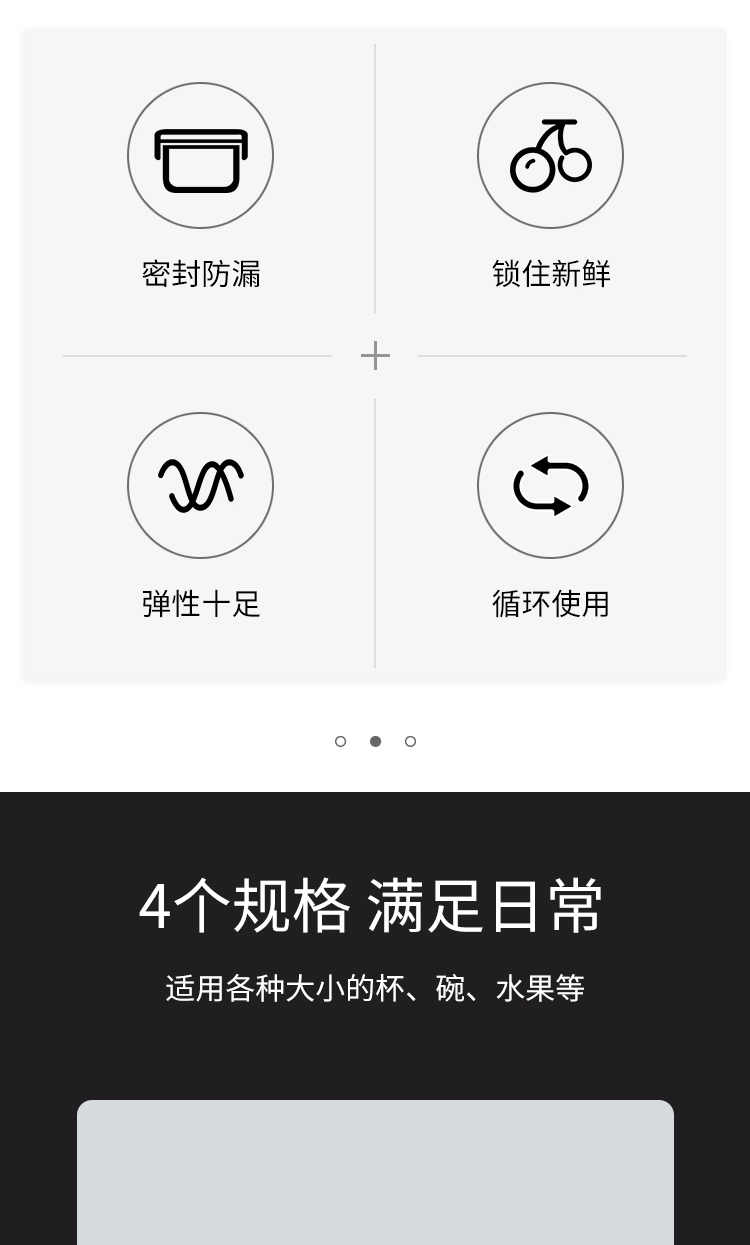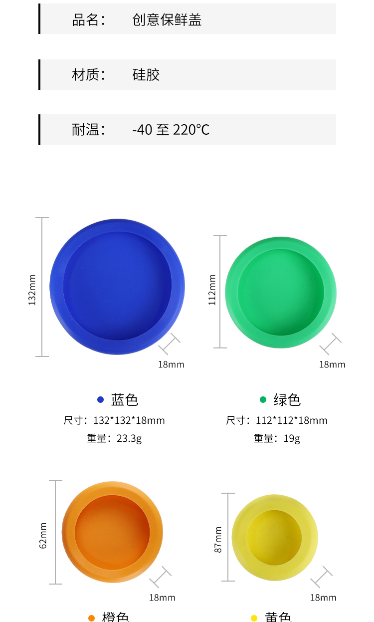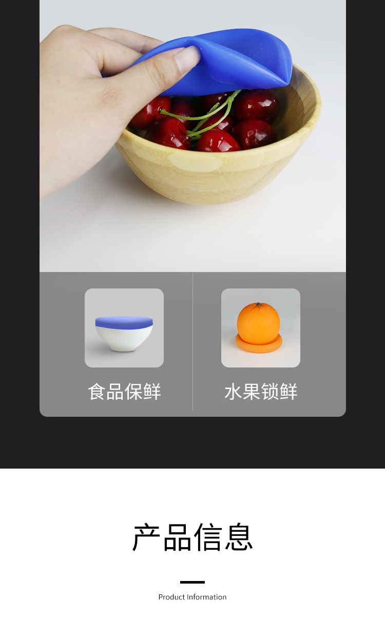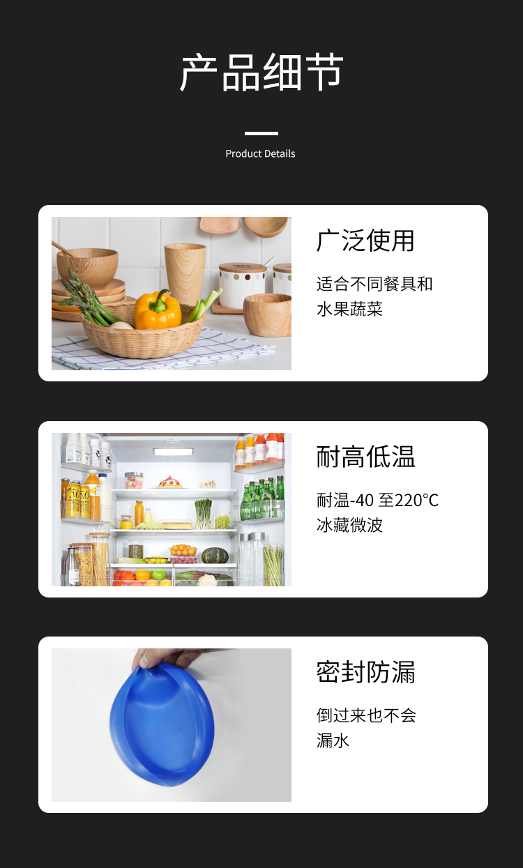 产品特点:适合不同餐具和水果蔬菜,耐温-40℃至220℃,冷藏微波,密封防漏