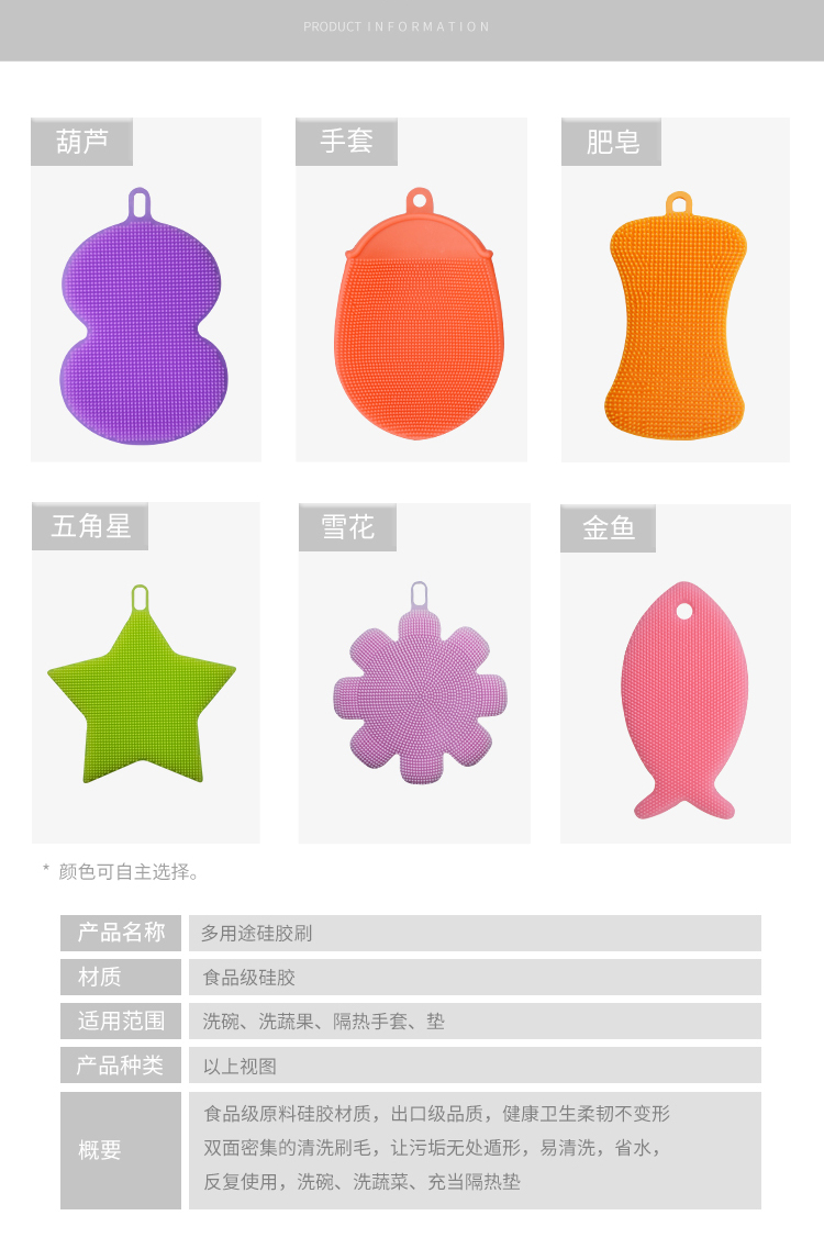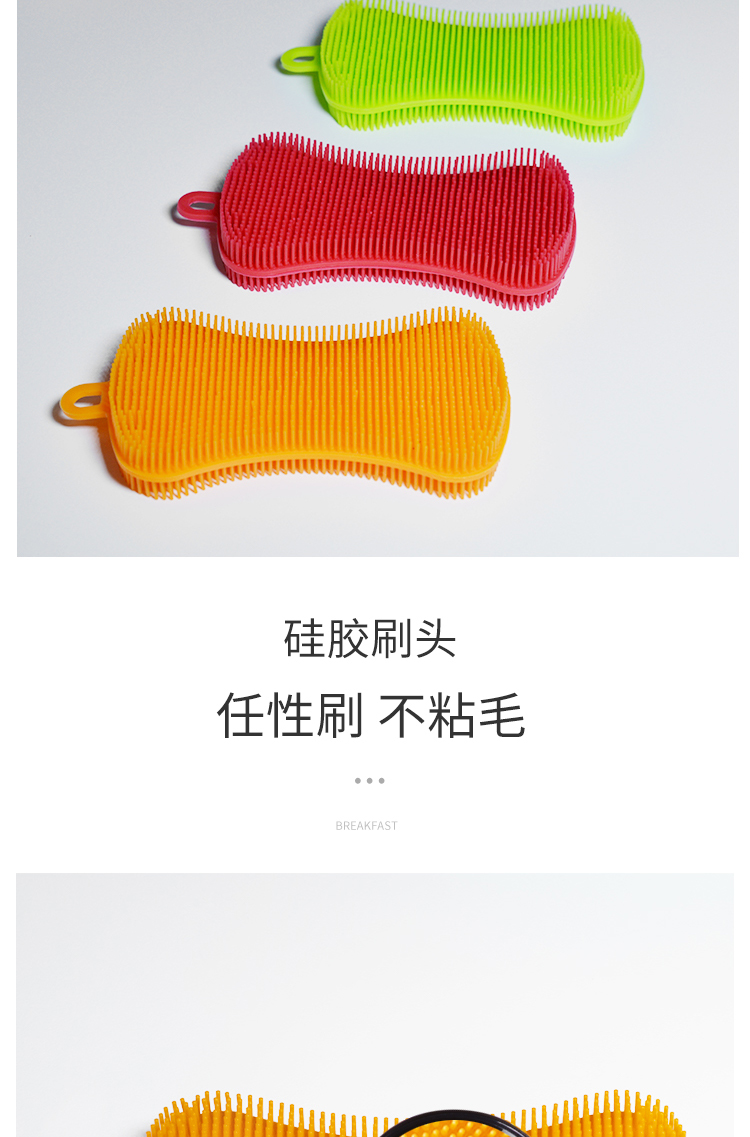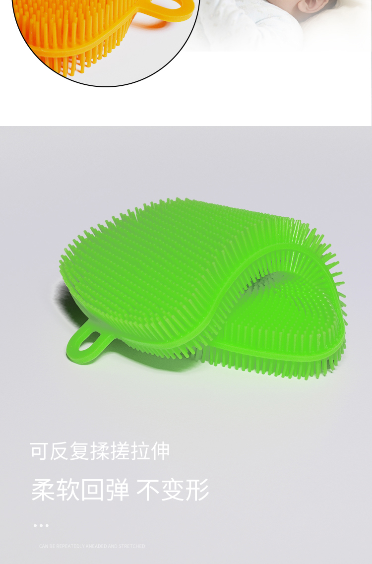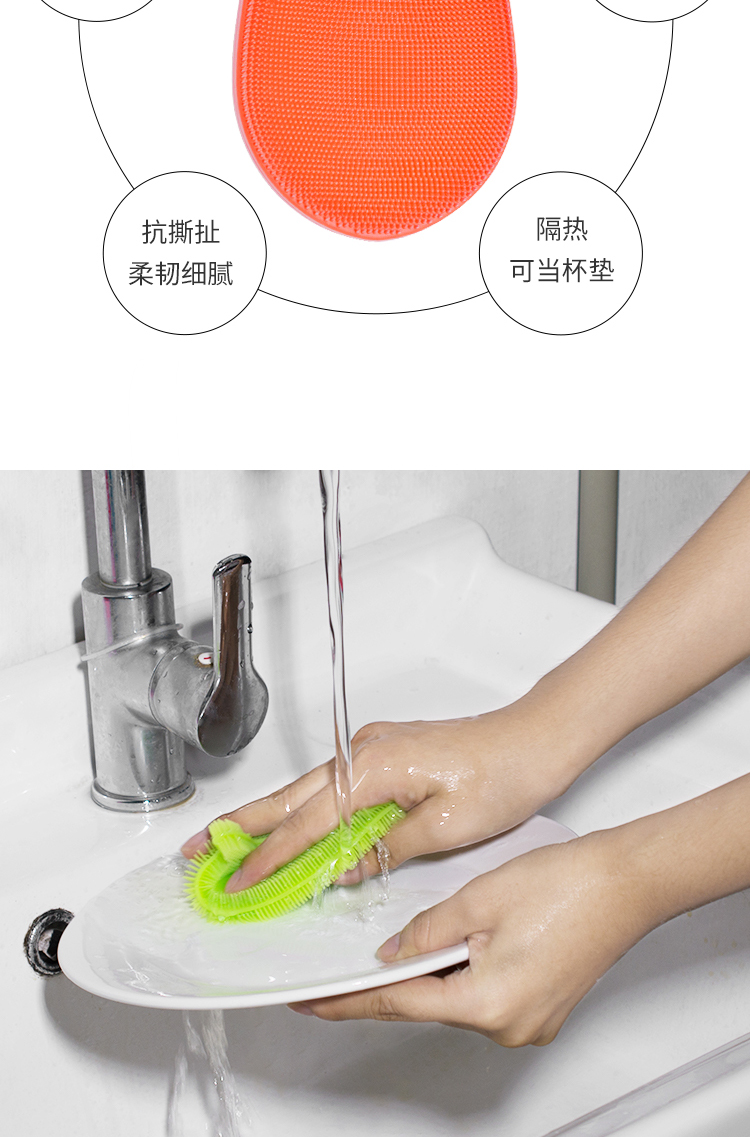 【特点】:食品级硅胶材质,安全环保,柔韧不变形,双面密集的清洗刷毛,让污渍无处遁形,可反复使用的百洁布,洗碗、洗果蔬、充当隔热手套都可以。
