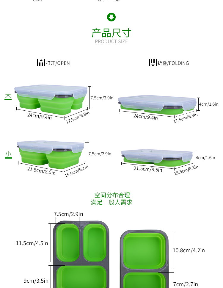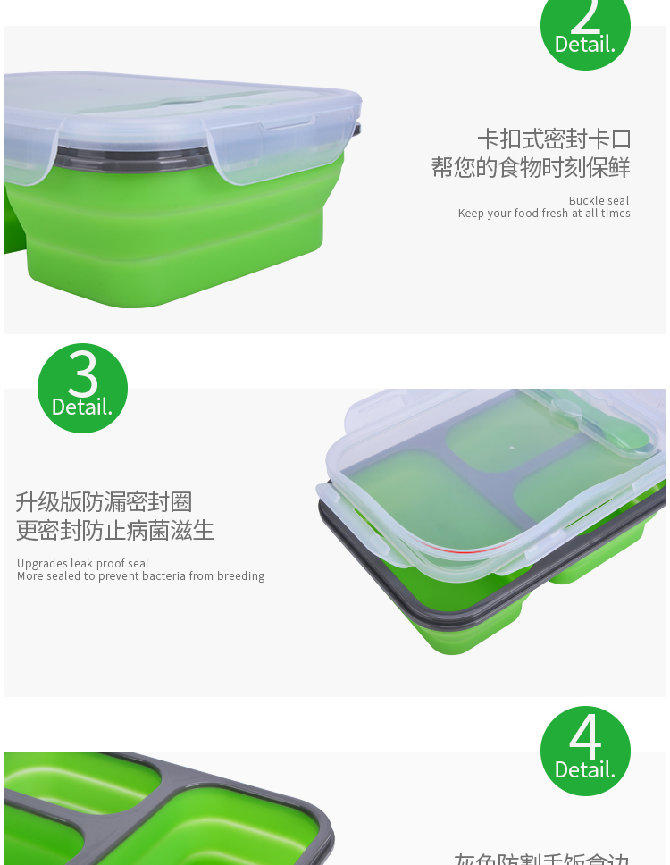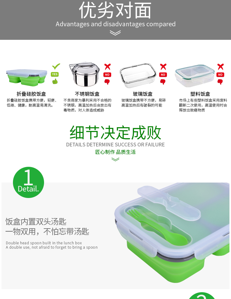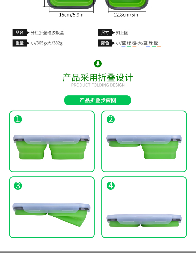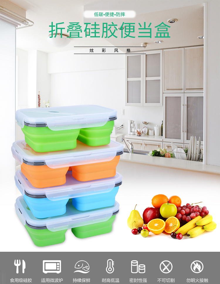 【产品名称】:硅胶折叠便当饭盒|微波炉加热保温饭盒|户外带叉勺密封便当盒