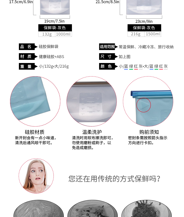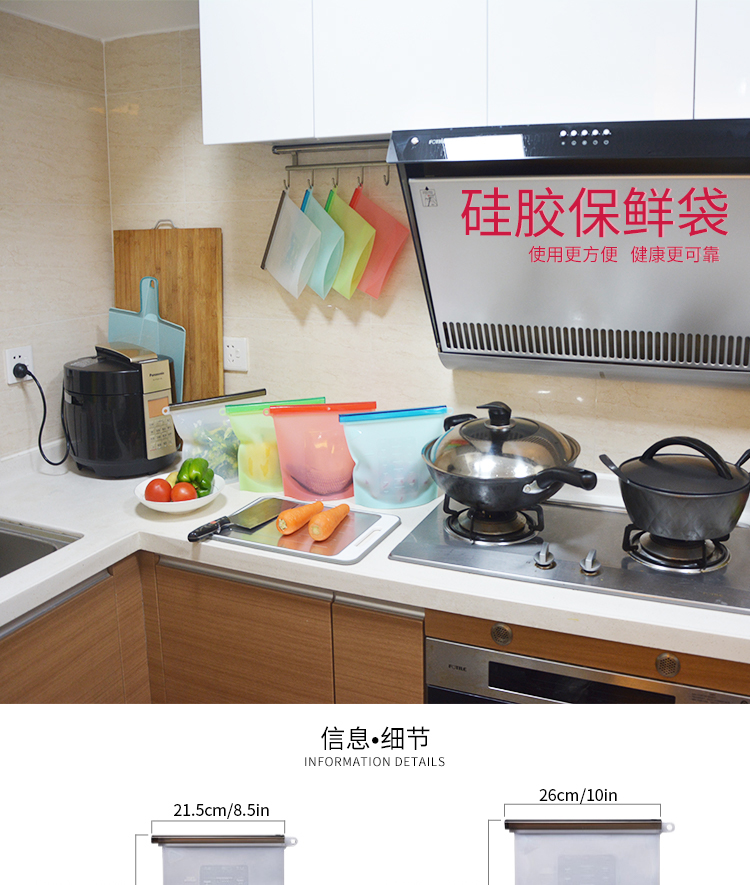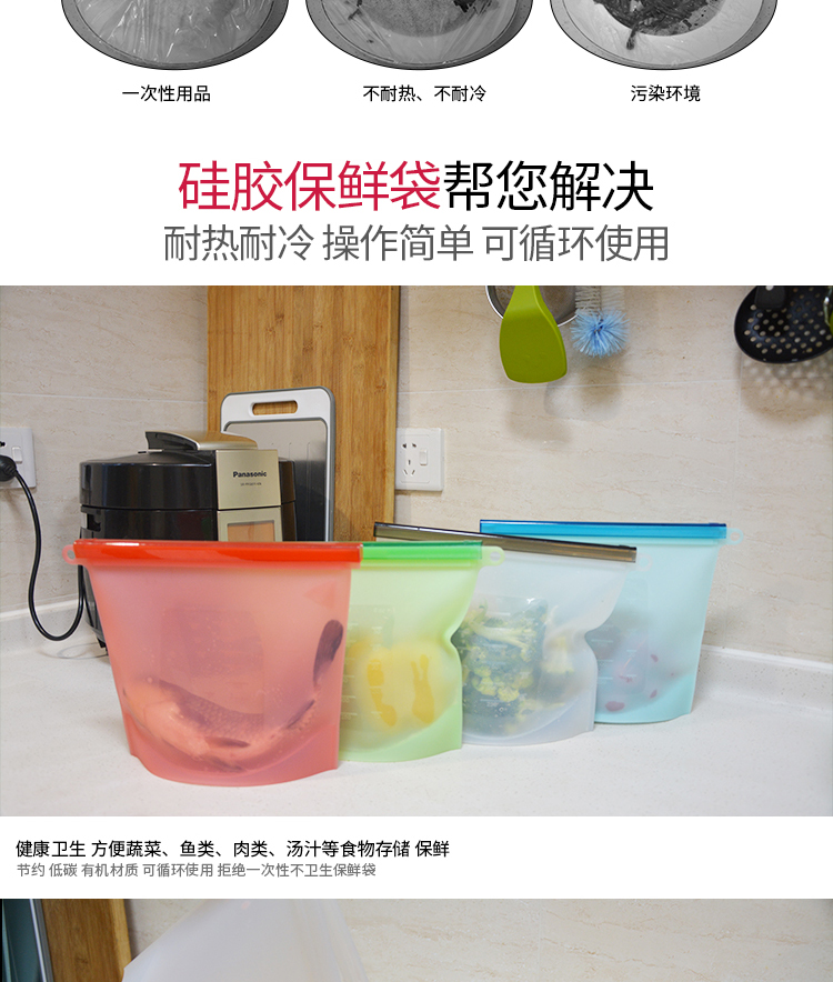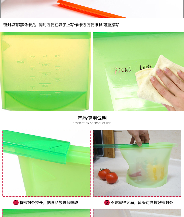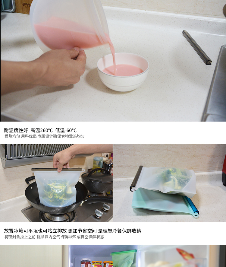 1,食品级硅胶材质,健康环保,拉动设计,密封坚固,易开,蔬菜,鱼,肉和果汁可以储存,不同的颜色可以按照德国和美国使用的食物与日常接触必需品标准(LFGB&FDA)。
