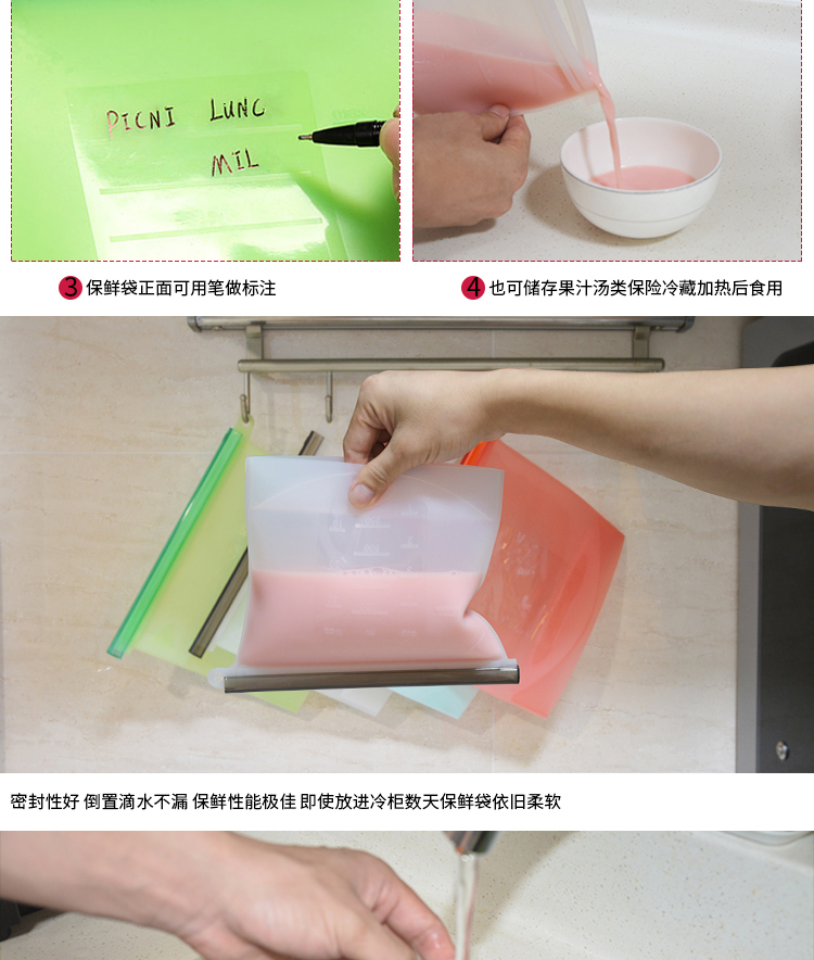 3,全新升级口袋卡槽,完全密封,不用再担心渗漏,加挂环,硅胶食品袋易于储存和干燥后清洗。