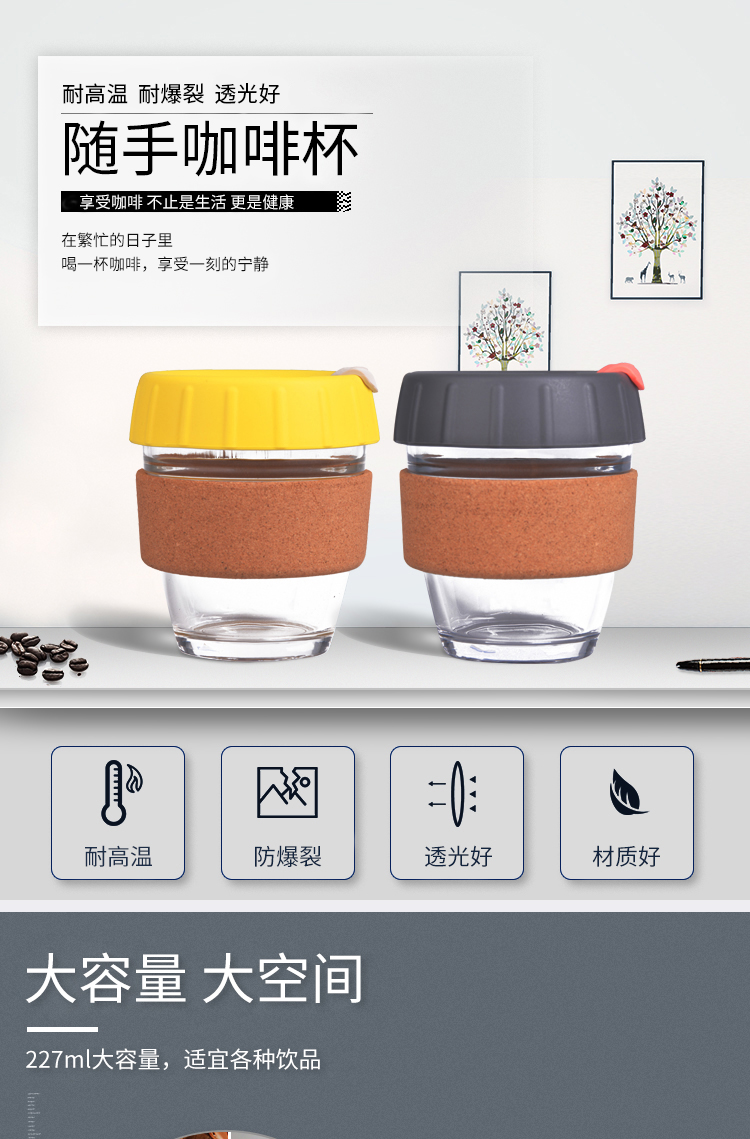 特点:杯子使用高硼硅玻璃为材料,耐热防震不易破碎,可耐温-40~220℃;食品级硅胶材质杯盖,加大饮孔饮水免后仰设计,活动扣关闭时可以覆盖饮孔周围;杯套使用复古个性软木作为隔热材料,产品支持批发、定制,还可为您定制品牌LOGO、节日礼品等多种水杯。