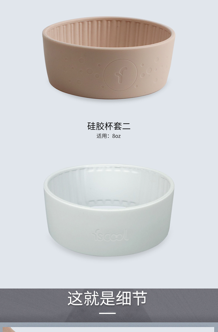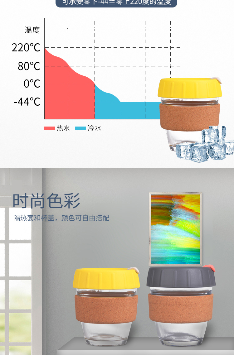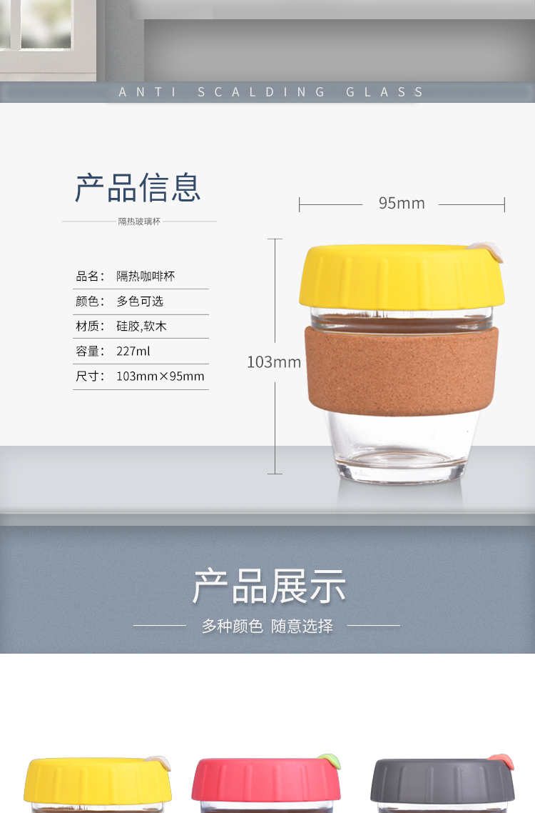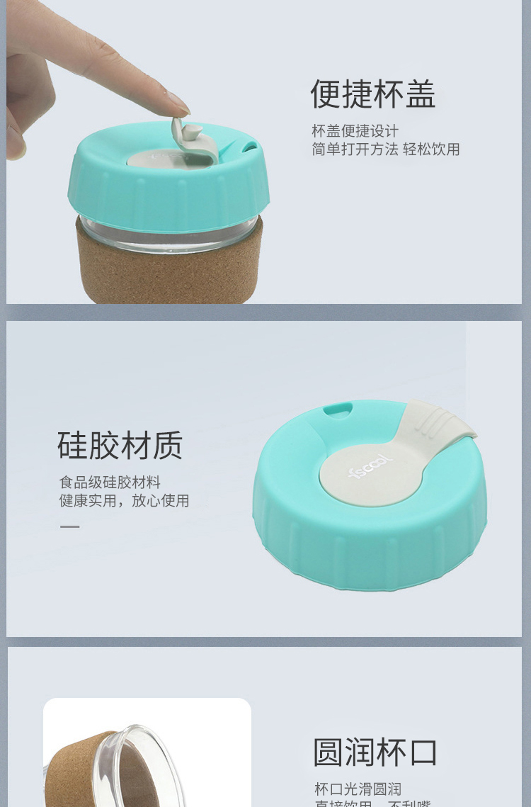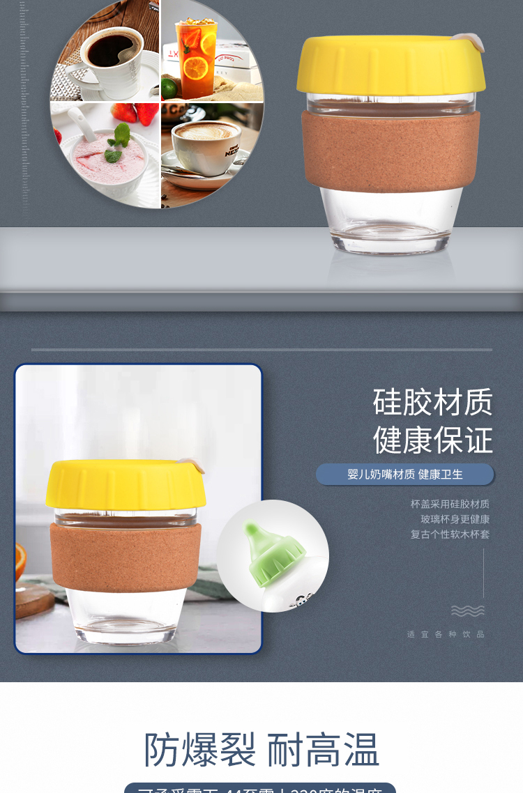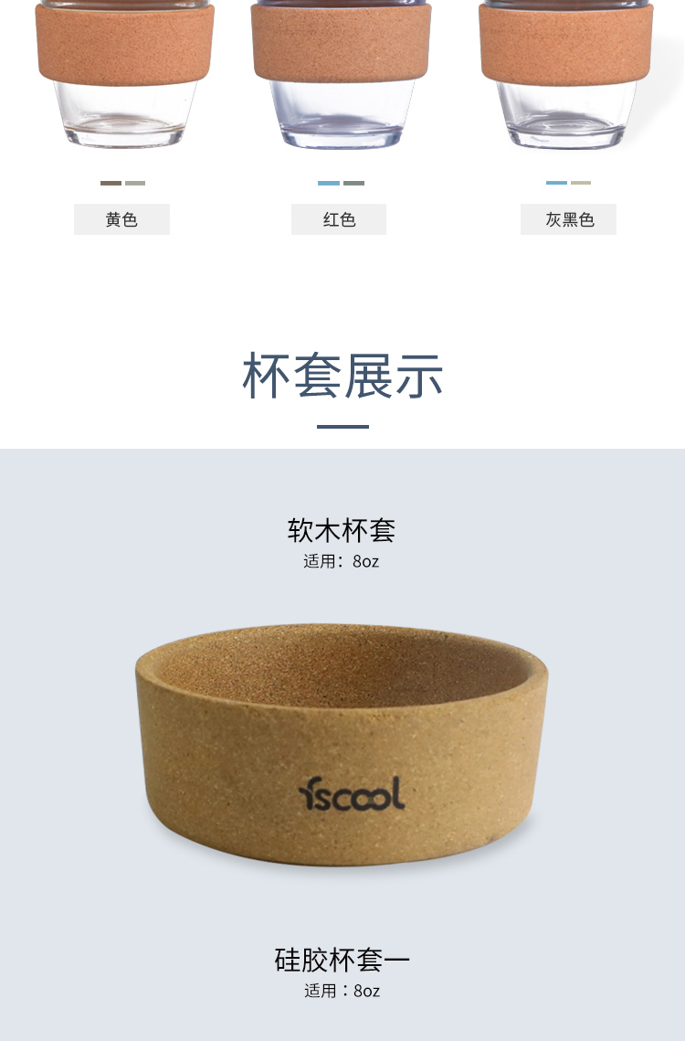 材质:食品级硅胶(杯盖)+玻璃(杯子)+软木(杯套)