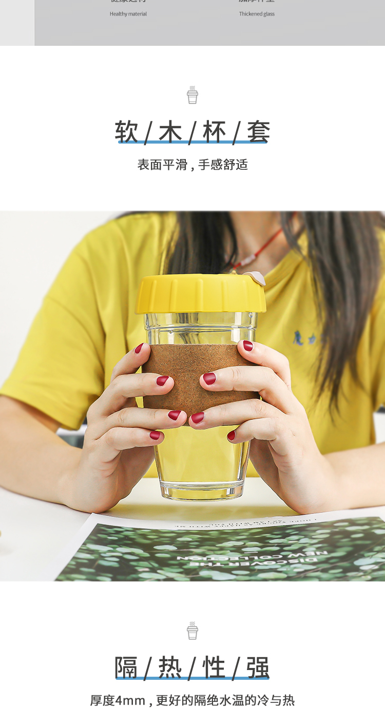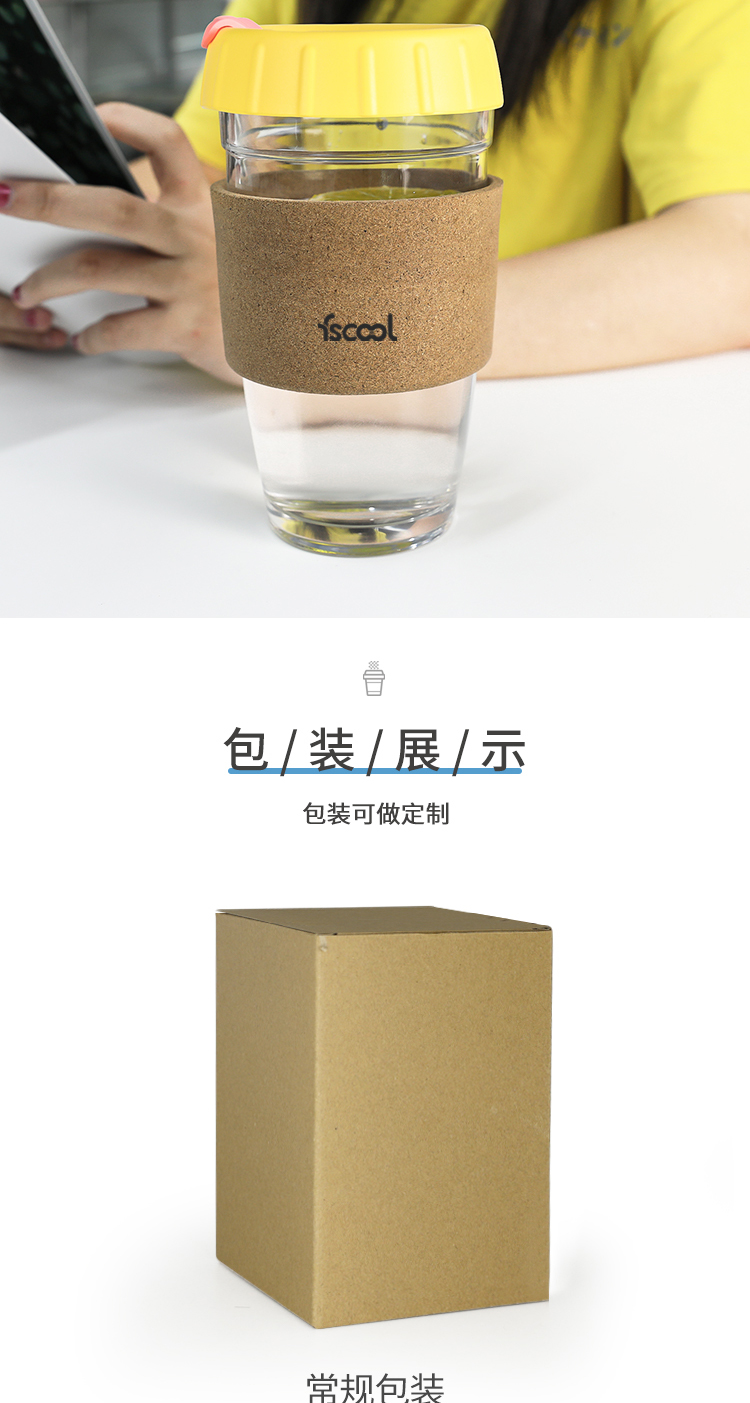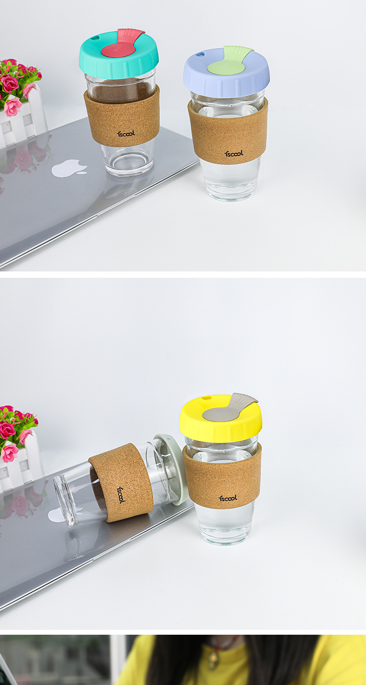 软木圈硅胶杯盖随手咖啡杯|时尚便携式防烫软木玻璃杯-荣进创意12oz软木套咖啡杯厂家批发