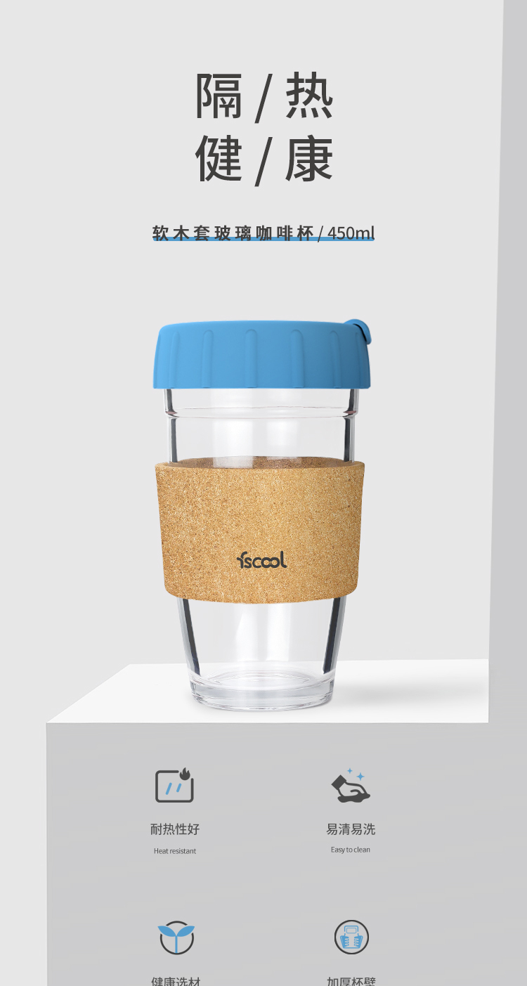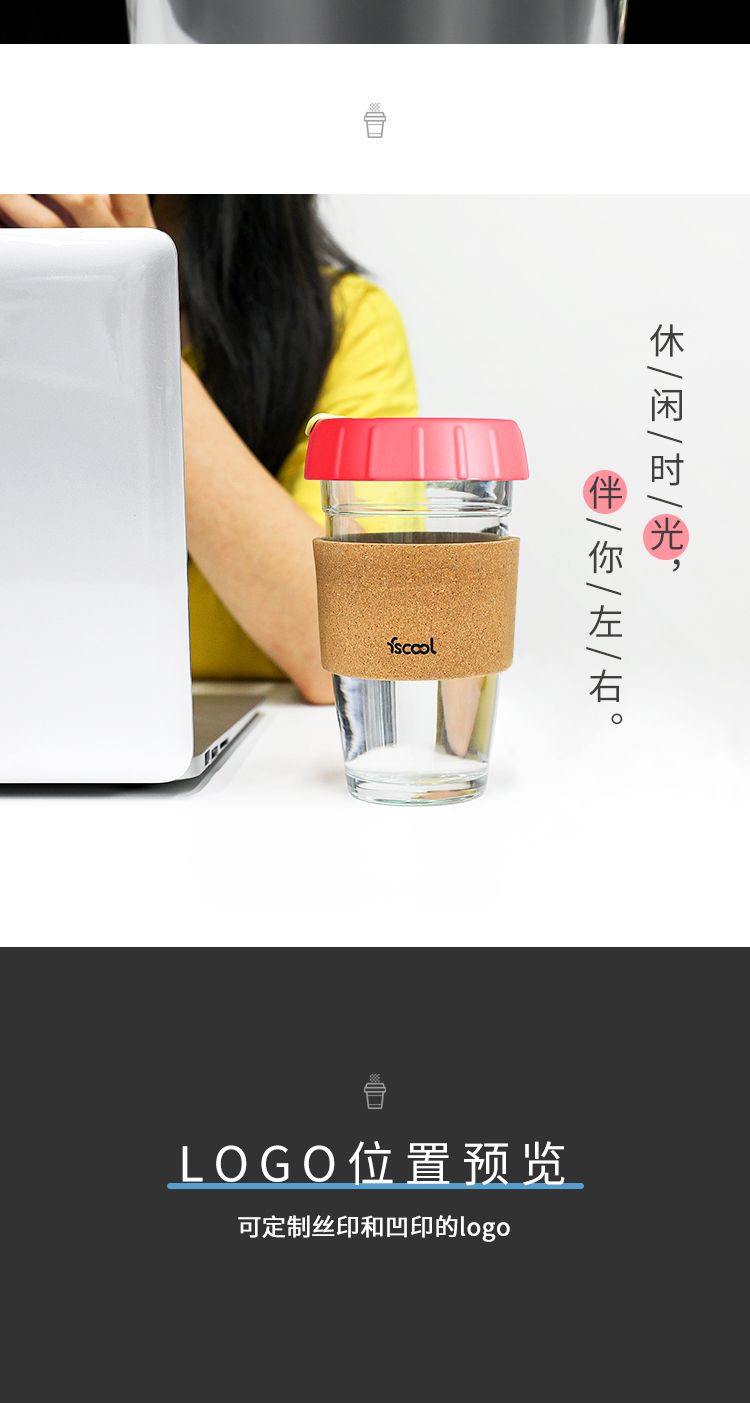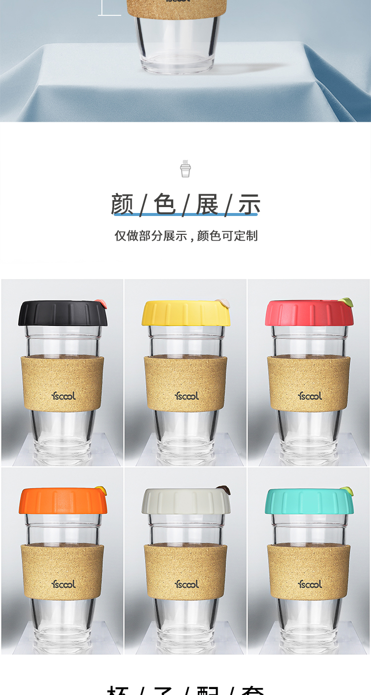 软木圈硅胶杯盖随手咖啡杯|时尚便携式防烫软木玻璃杯-荣进创意12oz软木套咖啡杯厂家批发