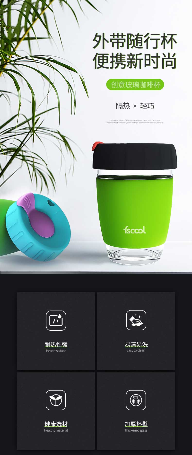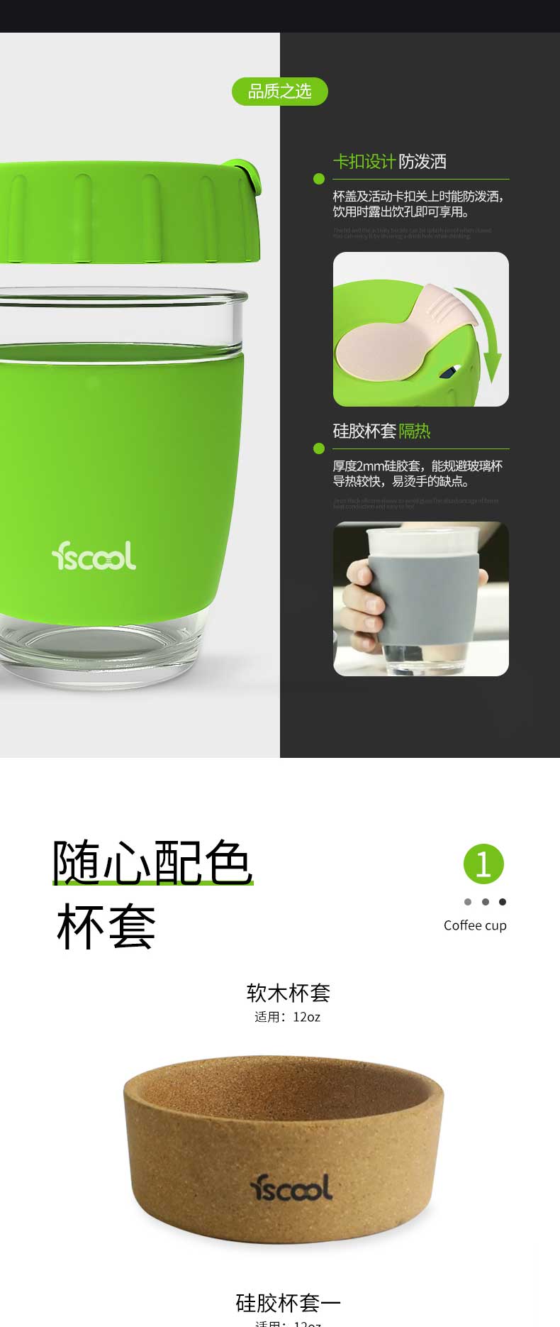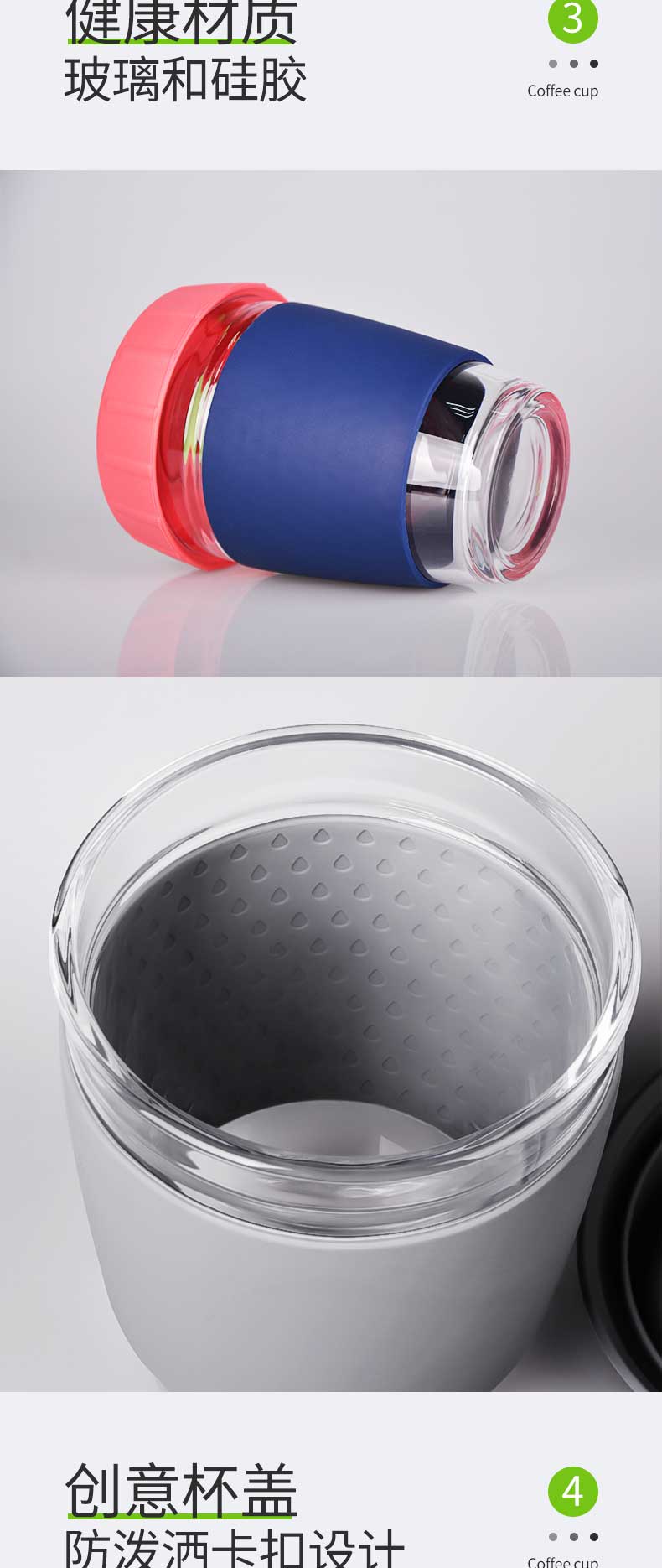 特点:使用高硼硅玻璃为材质的耐温玻璃杯,耐温防摔,可耐温-40~220℃;加宽加厚防滑防烫硅胶杯套有效防止因杯子盛有热饮烫手而滑落,食品级硅胶杯盖饮孔免后仰设计,杯盖带有旋转式密封杯扣;产品支持批发、定制,还可为您定制品牌LOGO、节日礼品等多种水杯。